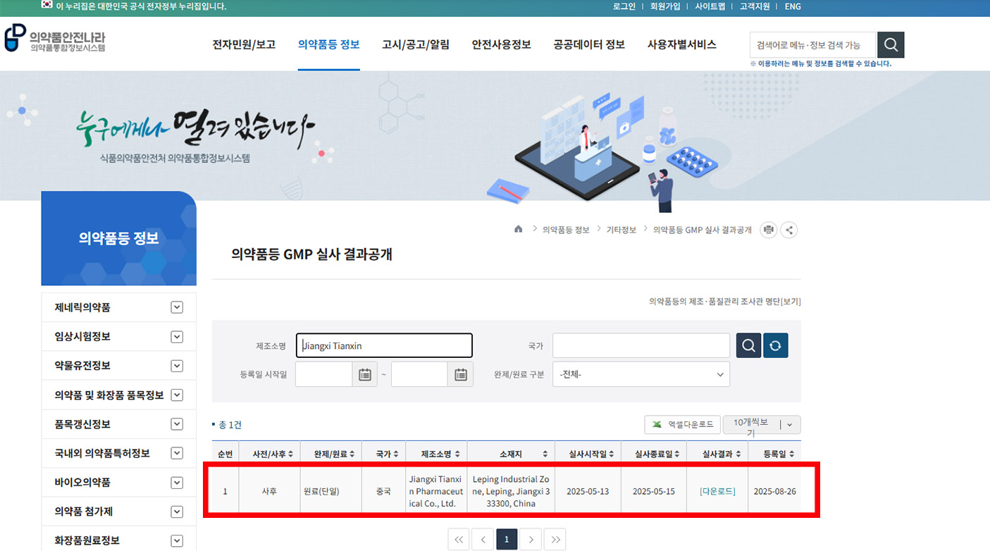 近日,公司收到韩国食品药品安全部(Ministry of Food and Drug Safety,简称MFDS)的通知,天新药业顺利通过MFDS的GMP现场检查,并在MFDS官网登记公示。